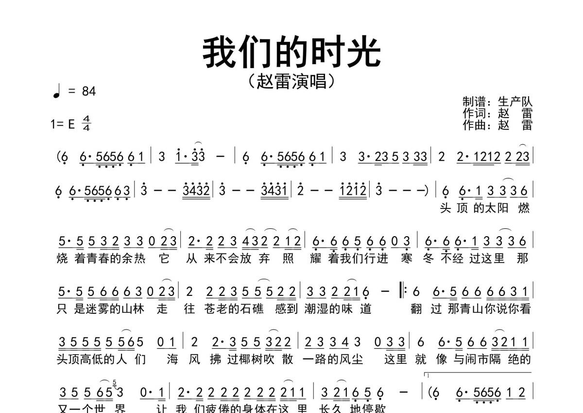 《我们的时光》是赵雷演唱的一首歌曲,原版简谱,拍号为4/4拍,歌曲速度为每分钟84拍,这份简谱共有一张高清图谱,图谱由 @生产队 编配上传赵雷演唱的歌曲《我们的时光》原版简谱。
