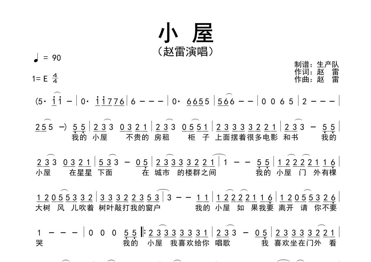 《小屋》是赵雷演唱的一首歌曲,原版简谱,拍号为4/4拍,歌曲速度为每分钟90拍,这份简谱共有一张高清图谱,图谱由 @生产队 编配上传赵雷演唱的歌曲《小屋》原版简谱。