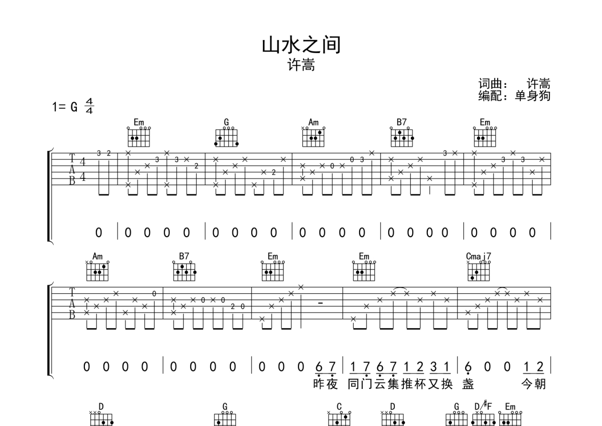 许嵩《山水之间》吉他谱 - G调弹唱六线谱