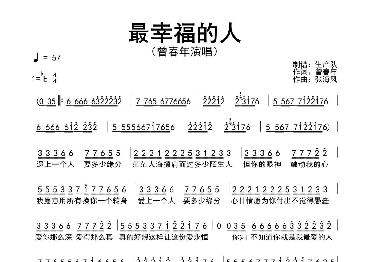 《最幸福的人》是曾春年演唱的一首歌曲,原版简谱,拍号为4/4拍,歌曲速度为每分钟57拍,这份简谱共有一张高清图谱,图谱由 @生产队 编配上传曾春年演唱的歌曲《最幸福的人》原版简谱。