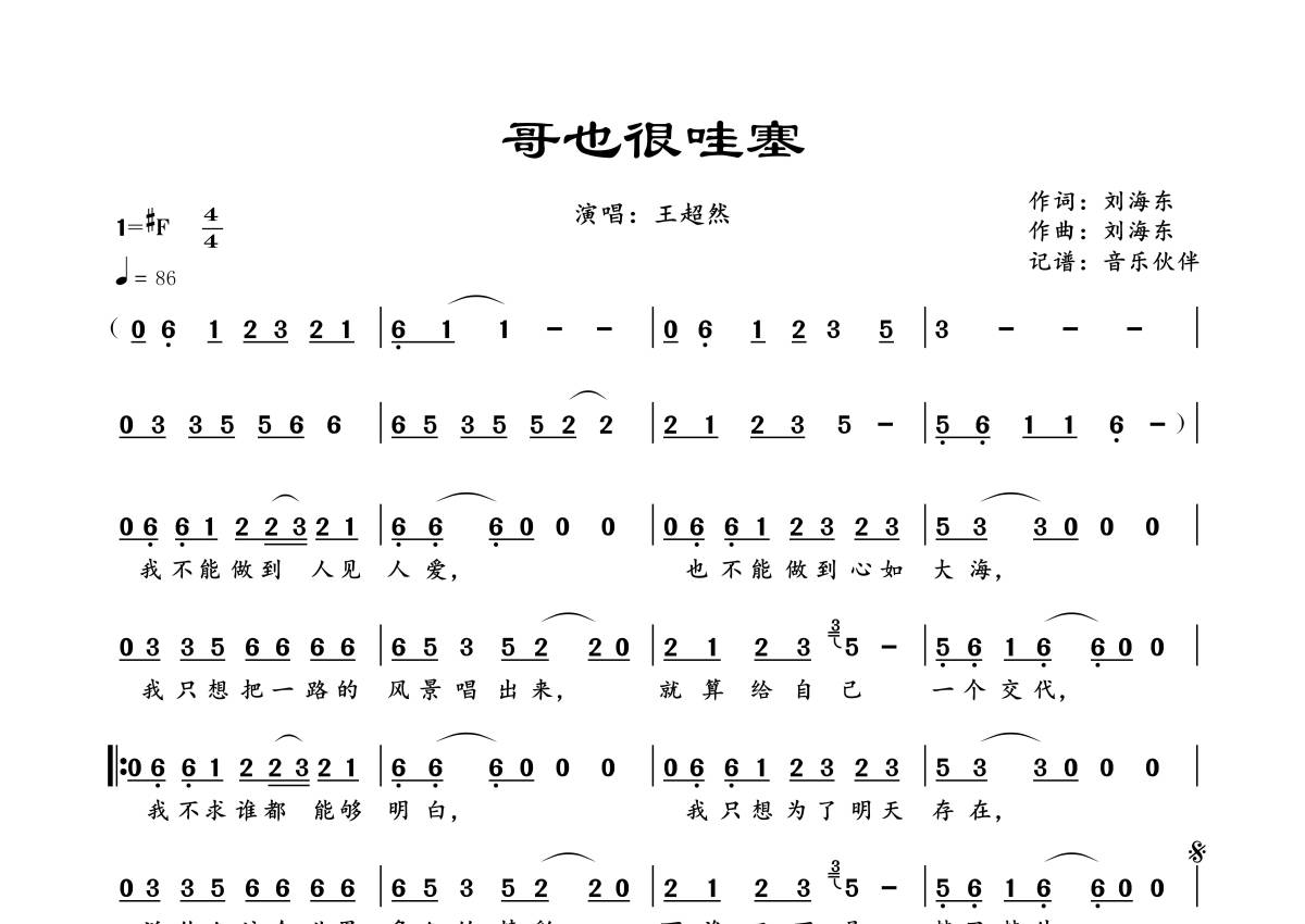 《哥也很哇塞》是王超然演唱的一首歌曲,拍号为4/4拍,歌曲速度为每分钟86拍,这份简谱共有一张高清图谱,图谱由 @音乐伙伴 编配上传。