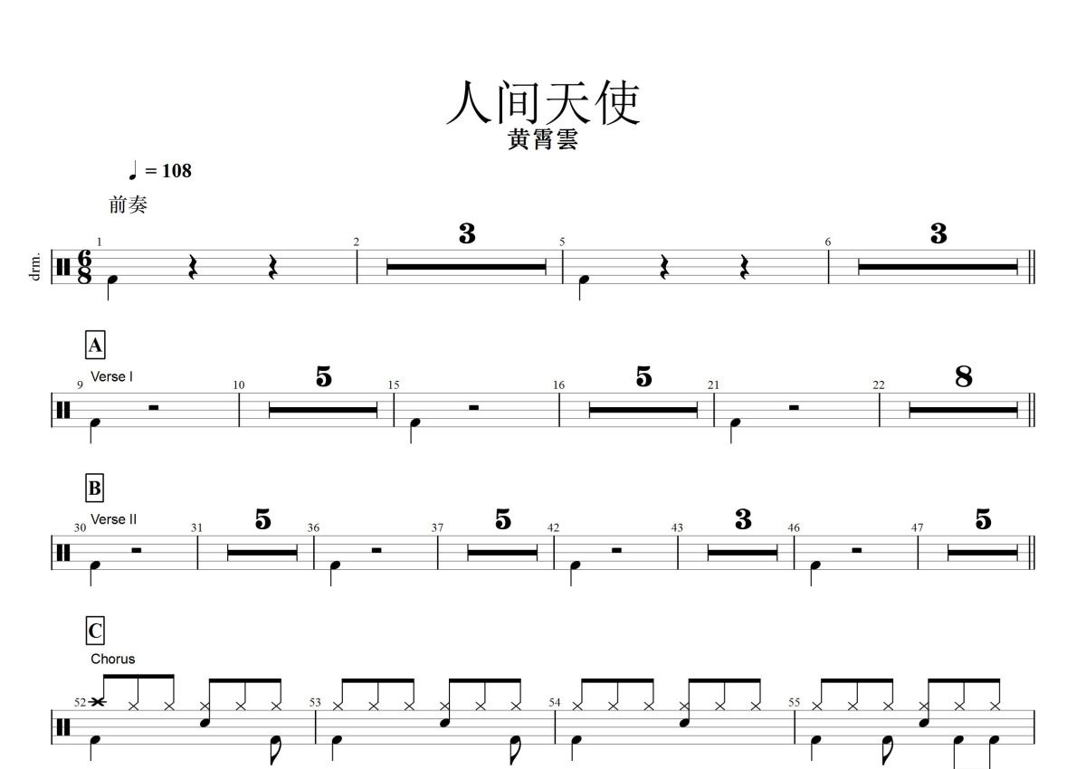 黄霄云《人间天使》鼓谱 - 架子鼓谱
