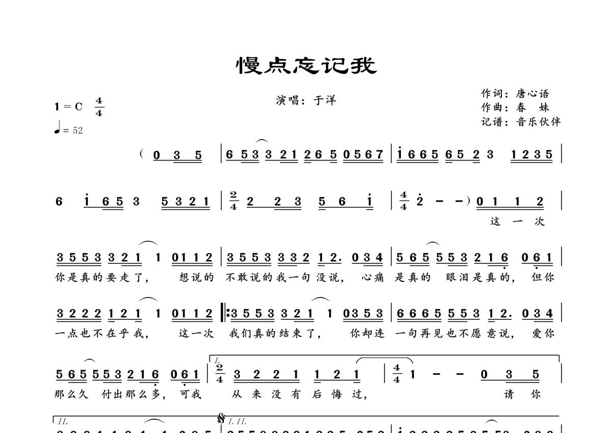 《慢点忘记我》是于洋演唱的一首歌曲,拍号为4/4拍,歌曲速度为每分钟52拍,这份简谱共有一张高清图谱,图谱由 @音乐伙伴 编配上传。
