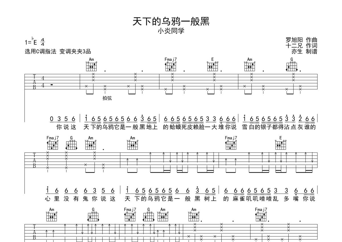 《天下的乌鸦一般黑》是小炎同学演唱的一首歌曲,拍号为4/4拍,歌曲原调为Eb调,但由于原调指法比较难,为了方便弹奏,本吉他谱采用的是C调指法编配,变调夹3品弹奏即为原调,当然也可以根据自己的音域改变变调夹位置,或者通过改变和弦调性,以方便自己弹奏,这份吉他谱共有两张高清图谱,图谱由 @亦生 编配上传,图谱使用六线谱编配,包含吉他和弦指法、简谱以及歌词部分,使用这份天下的乌鸦一般黑吉他谱,可以让你更加方便地掌握这首歌曲的弹唱技巧,快来尝试吧。