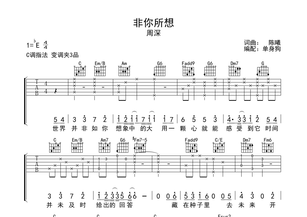 《非你所想》是周深演唱的一首歌曲,拍号为4/4拍,歌曲原调为Eb调,但由于原调指法比较难,为了方便弹奏,本吉他谱采用的是C调指法编配,变调夹3品弹奏即为原调,当然也可以根据自己的音域改变变调夹位置,或者通过改变和弦调性,以方便自己弹奏,这份吉他谱共有三张高清图谱,图谱由 @单身狗 编配上传,图谱使用六线谱编配,包含吉他和弦指法、简谱以及歌词部分,使用这份非你所想吉他谱,可以让你更加方便地掌握这首歌曲的弹唱技巧,快来尝试吧。