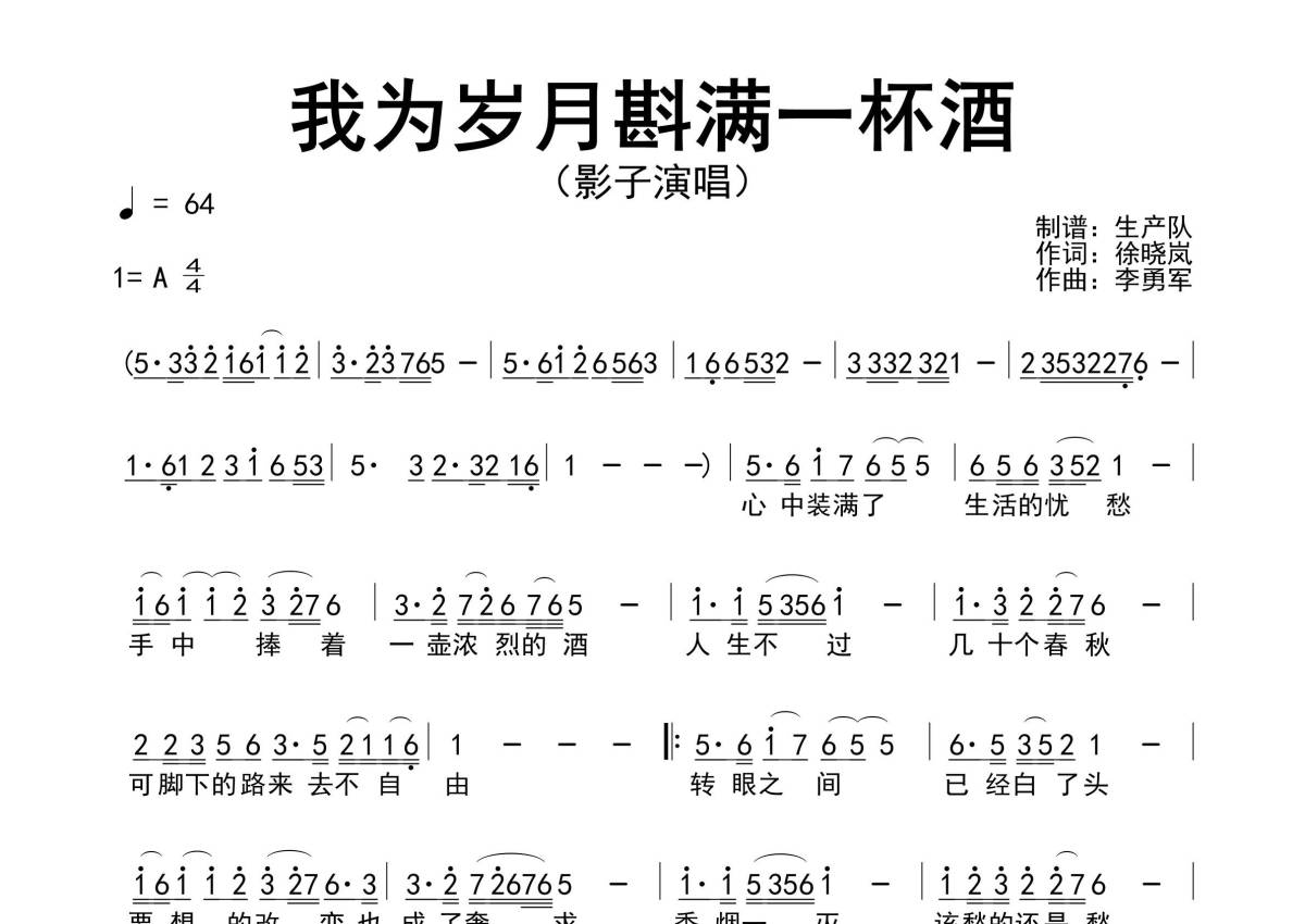 《我为岁月斟满一杯酒》是影子演唱的一首歌曲,原版简谱,拍号为4/4拍,歌曲速度为每分钟64拍,这份简谱共有一张高清图谱,图谱由 @生产队 编配上传影子演唱的歌曲《我为岁月斟满一杯酒》原版简谱。