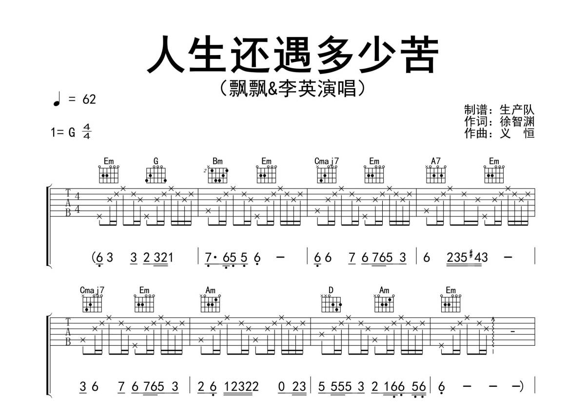 《人生还遇多少苦》是飘飘/李英演唱的一首歌曲,精编完美版,拍号为4/4拍,歌曲速度为每分钟62拍,歌曲原调为G调,本吉他谱采用的是G调指法编配,演奏时不需要使用变调夹即为原调,这份吉他谱共有三张高清图谱,图谱由 @生产队 编配上传,图谱使用六线谱编配,包含吉他和弦指法、简谱以及歌词部分,使用这份人生还遇多少苦吉他谱,可以让你更加方便地掌握这首歌曲的弹唱技巧,快来尝试吧。《人生还遇多少苦》是由飘飘&李英演唱的一首歌曲,徐智渊、飘飘作词,义恒作曲。本吉他谱根据原版G调指法编配,精准的前奏、间奏和SOLO编配,值得推荐!。