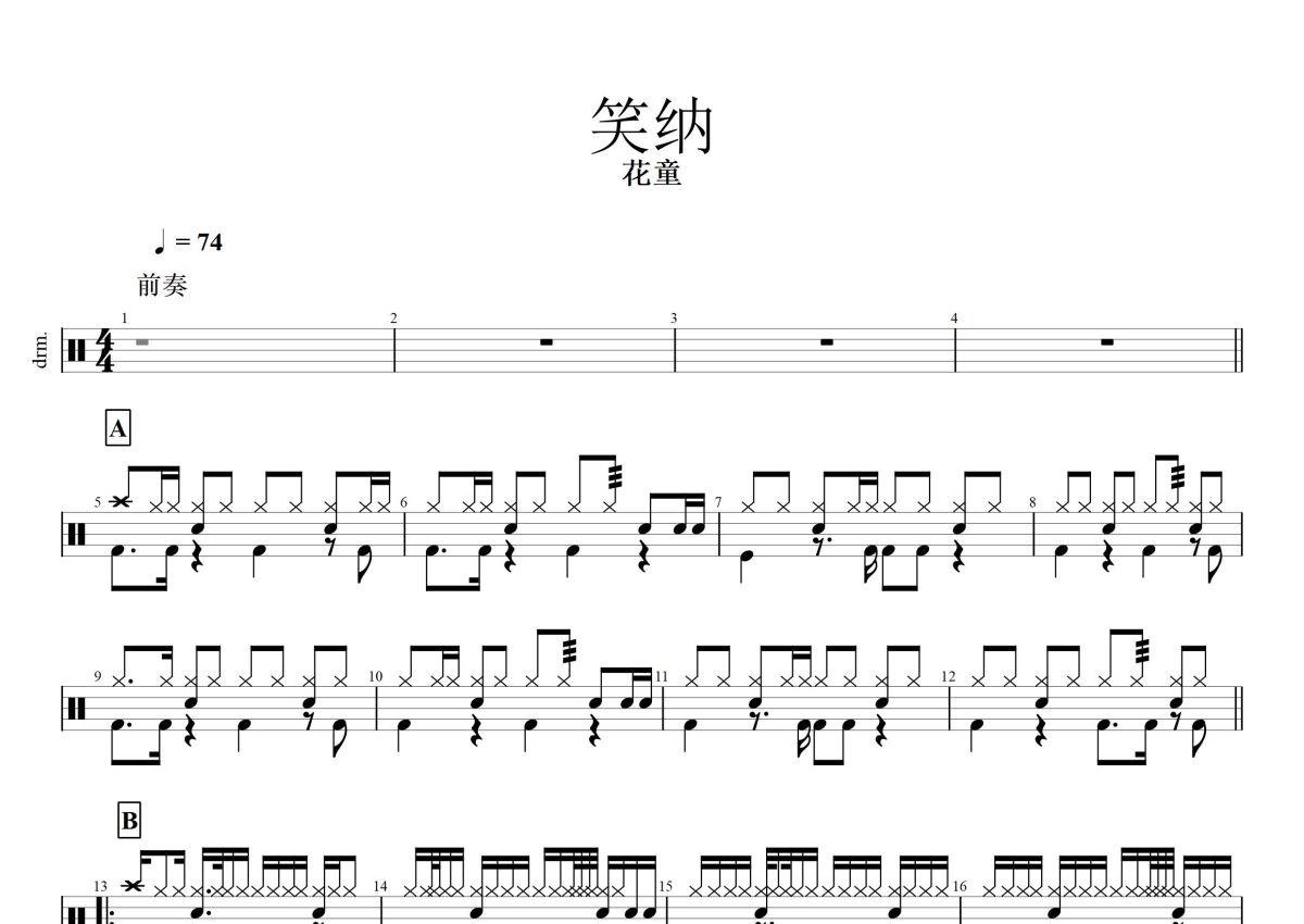《笑纳》是花童演唱的一首歌曲,这份鼓谱共有两张高清图谱,图谱由 @打鼓谱 编配上传,图谱使用五线谱编配,使用这份笑纳架子鼓谱,你将能够轻松地敲打出这首花童的笑纳,快来尝试吧。标准版。