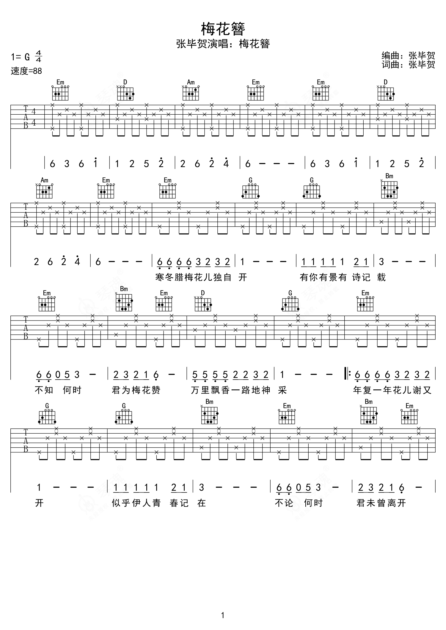 《梅花簪》是张毕贺演唱的一首歌曲,弹唱版,本吉他谱采用的是G调指法编配,这份吉他谱共有两张高清图谱,图谱由 @张毕贺 编配上传,图谱使用六线谱编配,包含吉他和弦指法、简谱以及歌词部分,使用这份梅花簪吉他谱,可以让你更加方便地掌握这首歌曲的弹唱技巧,快来尝试吧。中国内地男歌手,1987年1月17日出生于四川成都,身高1.68m。张毕贺自2013年发行单曲后,一直致力于原创音乐的创作和演唱。2014年,他发行了一张专辑,并在2015年对作品进行了进一步的修改和研究。2016年,他不断精益求精,并在实际生活中完成了原创作品《星烙印》和《情桥》。