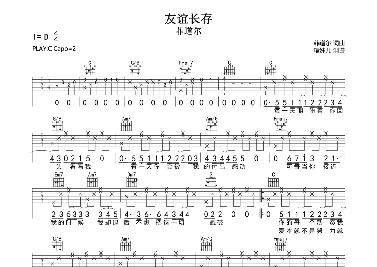 《友谊长存》是菲道尔演唱的一首歌曲,拍号为4/4拍,歌曲原调为D调,但由于原调指法比较难,为了方便弹奏,本吉他谱采用的是C调指法编配,变调夹2品弹奏即为原调,当然也可以根据自己的音域改变变调夹位置,或者通过改变和弦调性,以方便自己弹奏,这份吉他谱共有两张高清图谱,图谱由 @珺妹儿 编配上传,图谱使用六线谱编配,包含吉他和弦指法、简谱以及歌词部分,使用这份友谊长存吉他谱,可以让你更加方便地掌握这首歌曲的弹唱技巧,快来尝试吧。