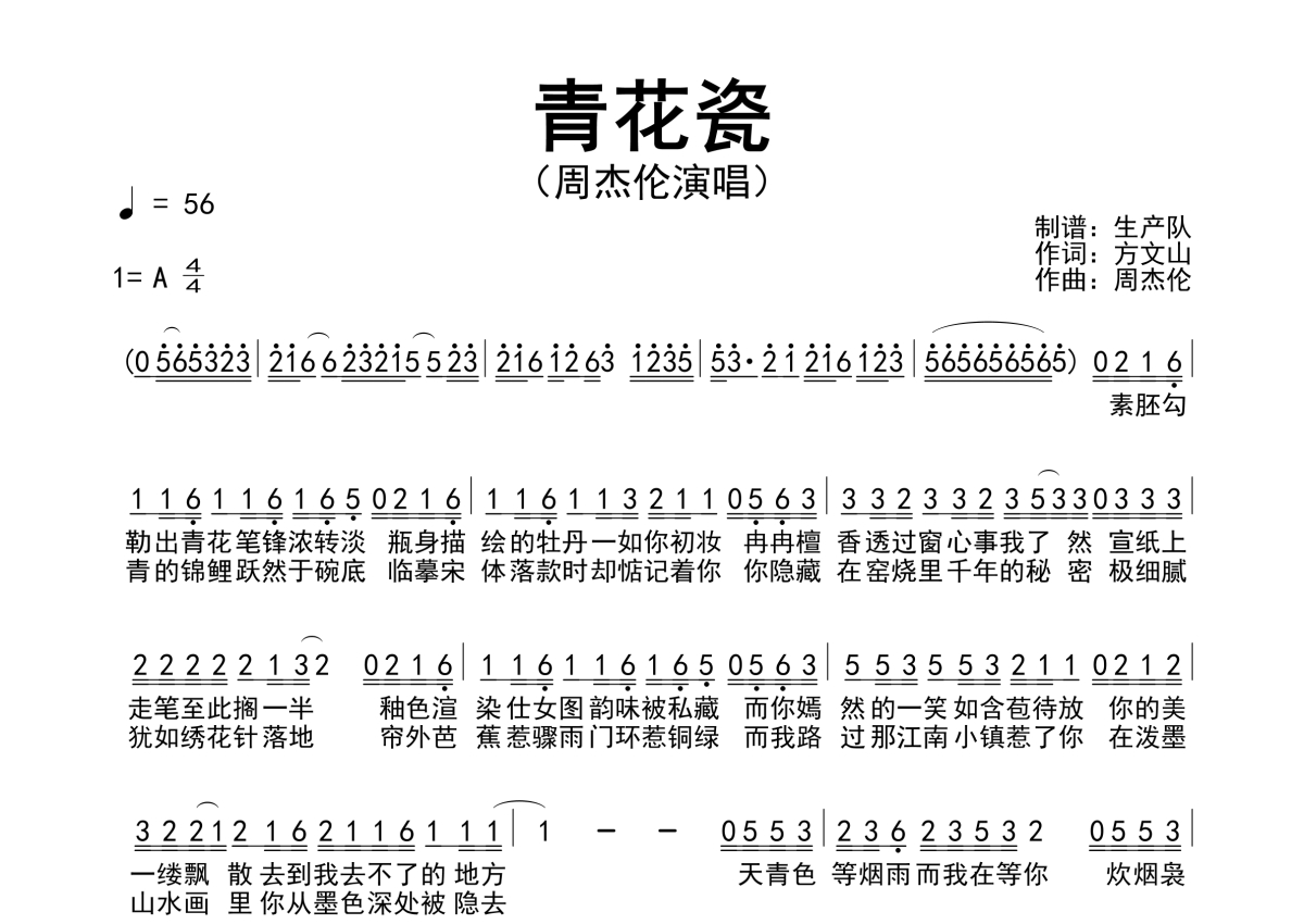 《青花瓷》是周杰伦演唱的一首歌曲,原版简谱,拍号为4/4拍,歌曲速度为每分钟56拍,这份简谱共有一张高清图谱,图谱由 @生产队 编配上传周杰伦演唱的歌曲《青花瓷》原版简谱。