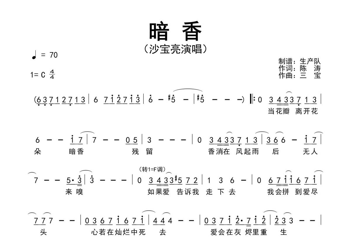 《暗香》是沙宝亮演唱的一首歌曲,原版简谱,拍号为4/4拍,歌曲速度为每分钟70拍,这份简谱共有一张高清图谱,图谱由 @生产队 编配上传《暗香》是沙宝亮演唱的一首歌曲,由陈涛填词,三宝作曲,该曲是电视剧《金粉世家》的主题歌。本简谱根据原版C调转F调指法编配,完整的前奏、间奏和SOLO编配,精编完美版,致敬经典!。