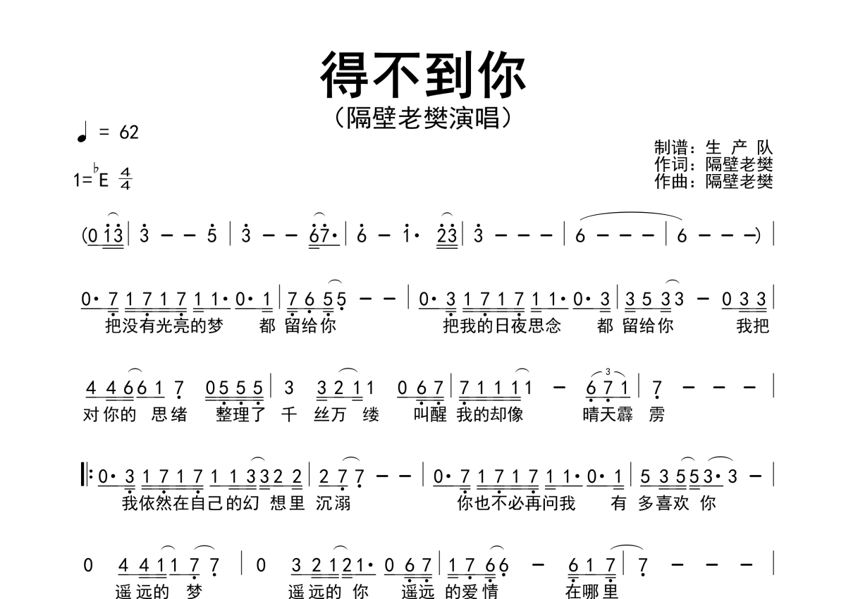 《得不到你》是隔壁老樊演唱的一首歌曲,原版简谱,拍号为4/4拍,歌曲速度为每分钟62拍,这份简谱共有一张高清图谱,图谱由 @生产队 编配上传隔壁老樊演唱的歌曲《得不到你》原版简谱。