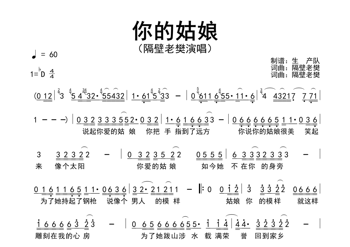 《你的姑娘》是隔壁老樊演唱的一首歌曲,原版简谱,拍号为4/4拍,歌曲速度为每分钟60拍,这份简谱共有一张高清图谱,图谱由 @生产队 编配上传隔壁老樊演唱的歌曲《你的姑娘》原版简谱。