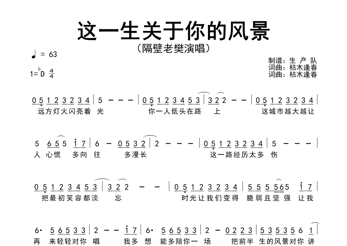 《这一生关于你的风景》是隔壁老樊演唱的一首歌曲,原版简谱,拍号为4/4拍,歌曲速度为每分钟63拍,这份简谱共有一张高清图谱,图谱由 @生产队 编配上传隔壁老樊演唱的歌曲《这一生关于你的风景》原版简谱。
