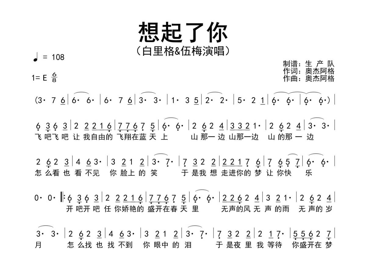 《想起了你》是白里格/伍梅演唱的一首歌曲,原版简谱,拍号为6/8拍,歌曲速度为每分钟108拍,这份简谱共有一张高清图谱,图谱由 @生产队 编配上传白里格&伍梅演唱的歌曲《想起了你》,该曲也是电影《多想活着》的主题曲。
