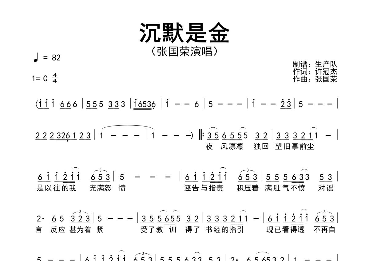 《沉默是金》是张国荣演唱的一首歌曲,原版简谱,拍号为4/4拍,歌曲速度为每分钟82拍,这份简谱共有一张高清图谱,图谱由 @生产队 编配上传张国荣演唱的歌曲《沉默是金》原版简谱。