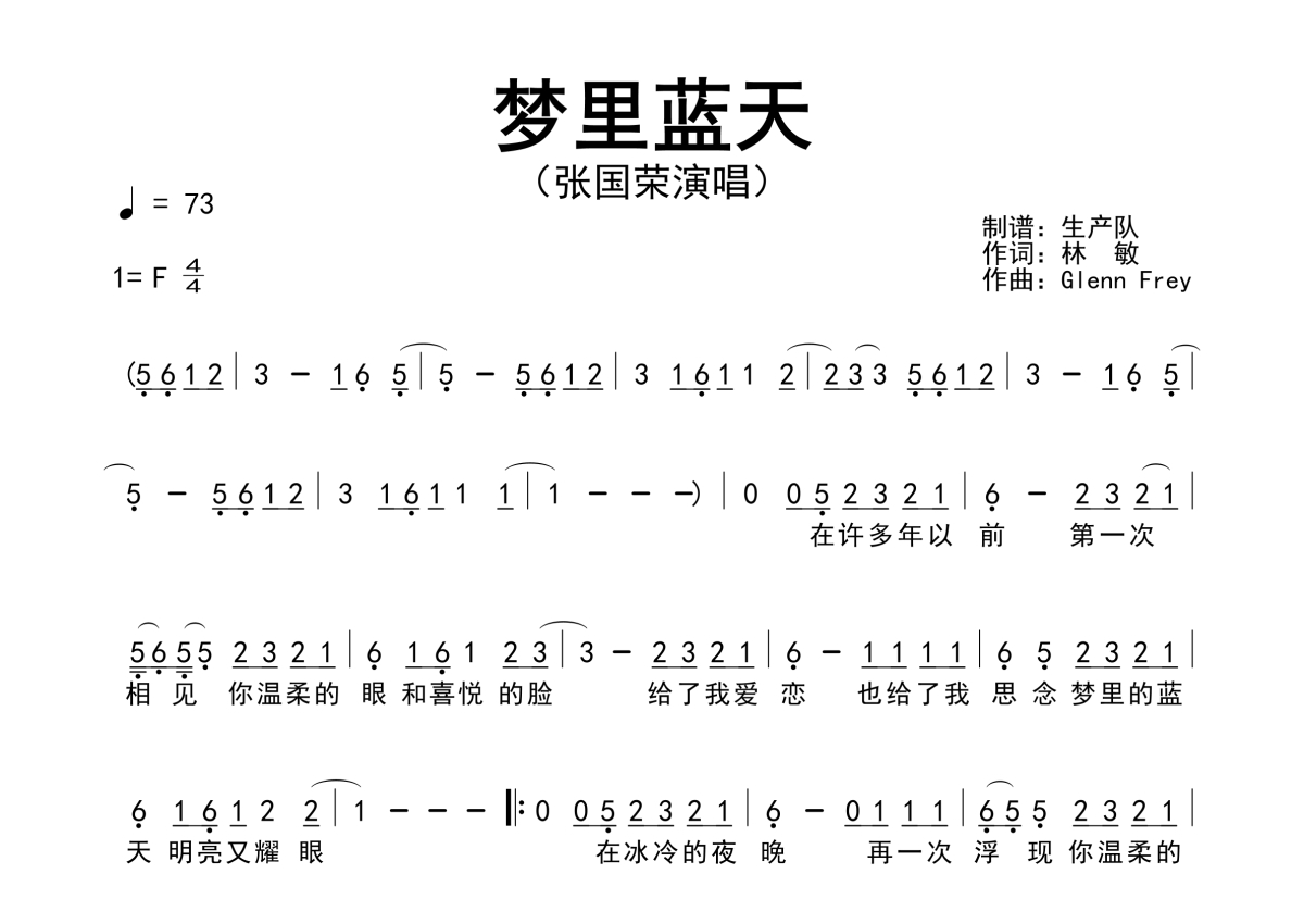 《梦里蓝天》是张国荣演唱的一首歌曲,原版简谱,拍号为4/4拍,歌曲速度为每分钟73拍,这份简谱共有一张高清图谱,图谱由 @生产队 编配上传张国荣演唱的歌曲《梦里蓝天》原版简谱。