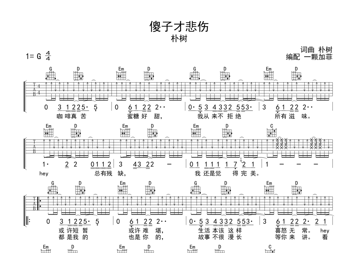 朴树《傻子才悲伤》吉他谱 - G调弹唱六线谱