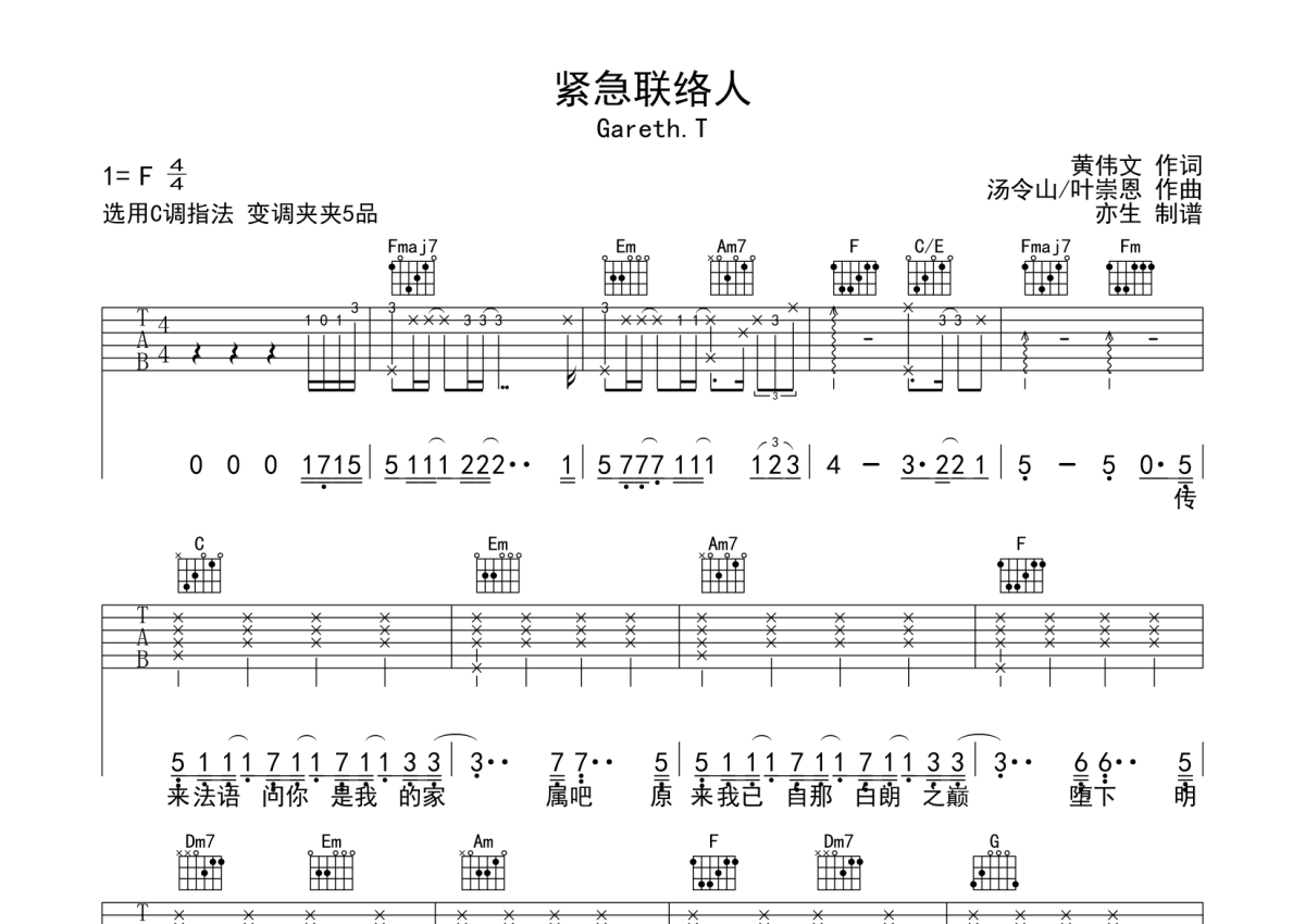 紧急联络人吉他谱 - Gareth.T - C调弹唱六线谱