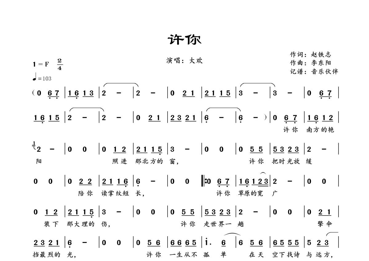 《许你》是大欢演唱的一首歌曲,拍号为2/4拍,歌曲速度为每分钟103拍,这份简谱共有一张高清图谱,图谱由 @音乐伙伴 编配上传。