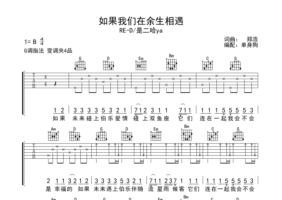 《如果我们在余生相遇》是RE-D/是二哈ya演唱的一首歌曲,拍号为4/4拍,歌曲原调为B调,但由于原调指法比较难,为了方便弹奏,本吉他谱采用的是G调指法编配,变调夹4品弹奏即为原调,当然也可以根据自己的音域改变变调夹位置,或者通过改变和弦调性,以方便自己弹奏,这份吉他谱共有六张高清图谱,图谱由 @单身狗 编配上传,图谱使用六线谱编配,包含吉他和弦指法、简谱以及歌词部分,使用这份如果我们在余生相遇吉他谱,可以让你更加方便地掌握这首歌曲的弹唱技巧,快来尝试吧。