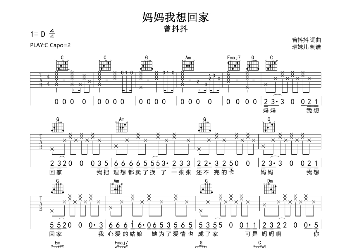妈妈我想回家吉他谱 - 曾抖抖 - C调弹唱六线谱