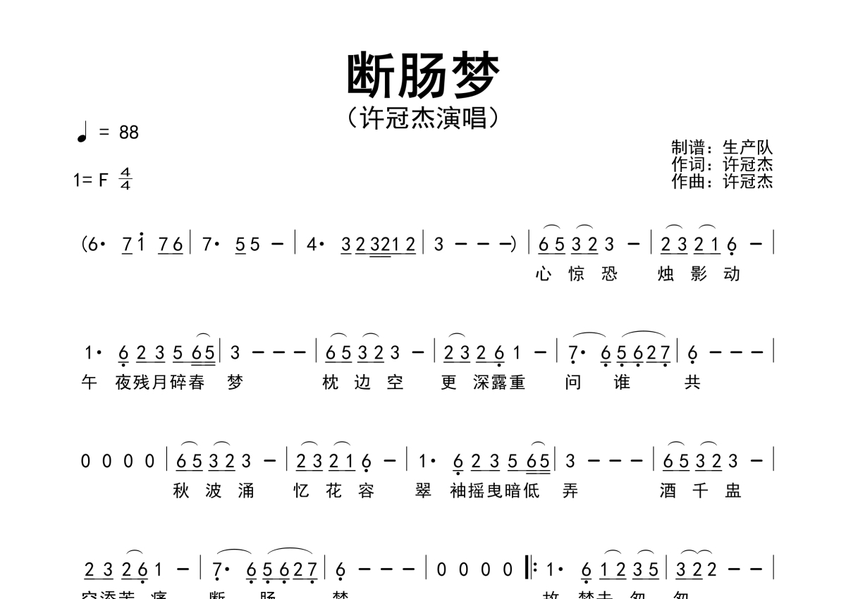 《断肠梦》是许冠杰演唱的一首歌曲,原版简谱,拍号为4/4拍,歌曲速度为每分钟88拍,这份简谱共有一张高清图谱,图谱由 @生产队 编配上传许冠杰演唱的歌曲《断肠梦》原版简谱。