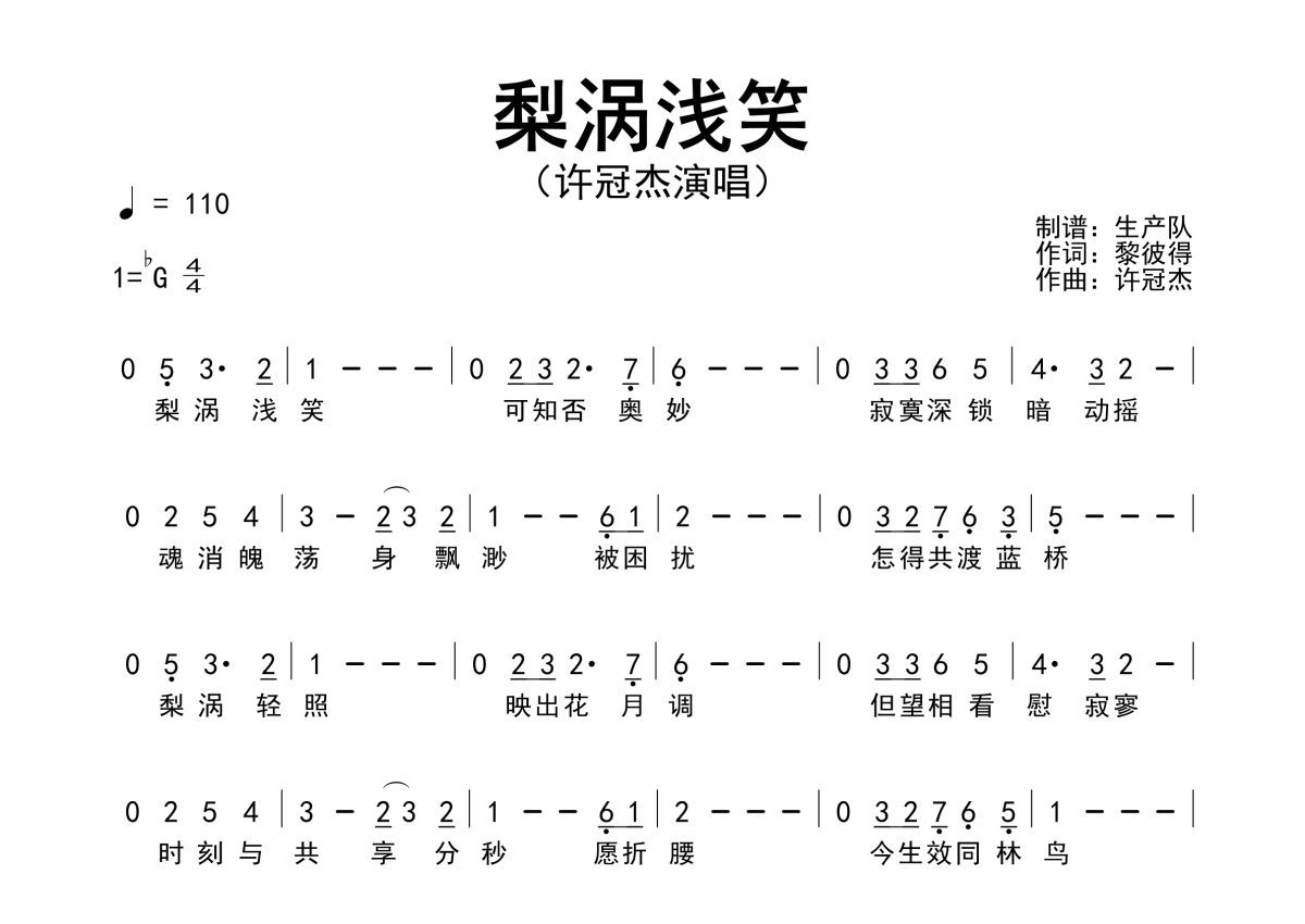 《梨涡浅笑》是许冠杰演唱的一首歌曲,原版简谱,拍号为4/4拍,歌曲速度为每分钟110拍,这份简谱共有一张高清图谱,图谱由 @生产队 编配上传许冠杰演唱的歌曲《梨涡浅笑》原版简谱。