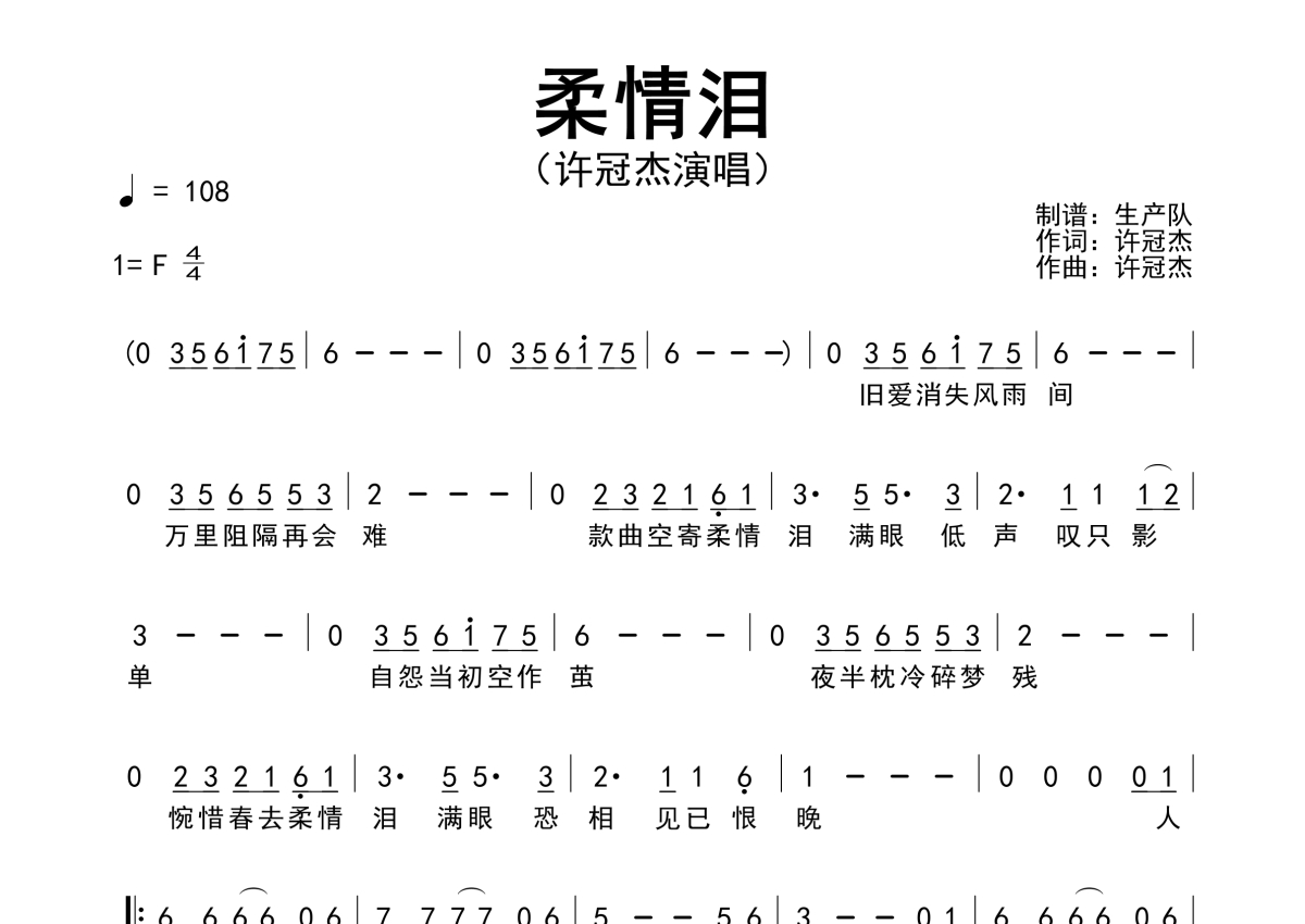 《柔情泪》是许冠杰演唱的一首歌曲,原版简谱,拍号为4/4拍,歌曲速度为每分钟108拍,这份简谱共有一张高清图谱,图谱由 @生产队 编配上传许冠杰演唱的歌曲《柔情泪》原版简谱。