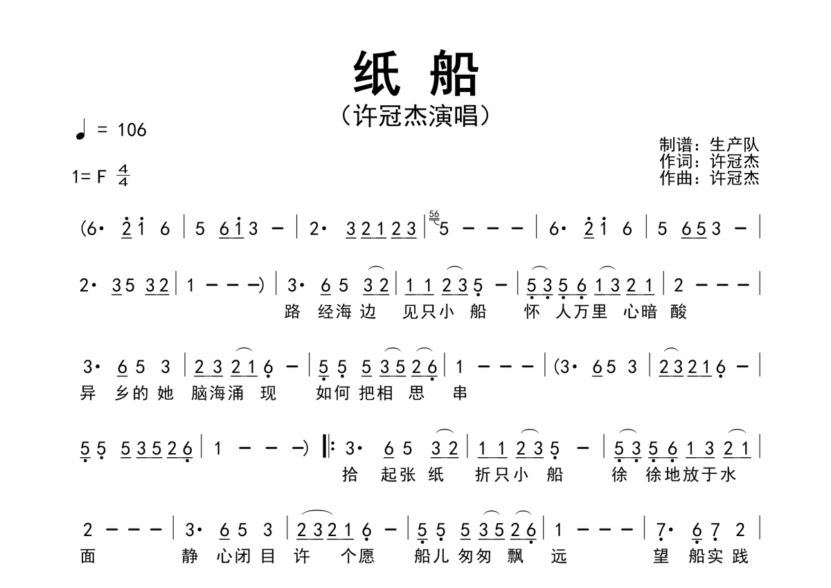 《纸船》是许冠杰演唱的一首歌曲,原版简谱,拍号为4/4拍,歌曲速度为每分钟105拍,这份简谱共有一张高清图谱,图谱由 @生产队 编配上传许冠杰演唱的歌曲《纸船》原版简谱。