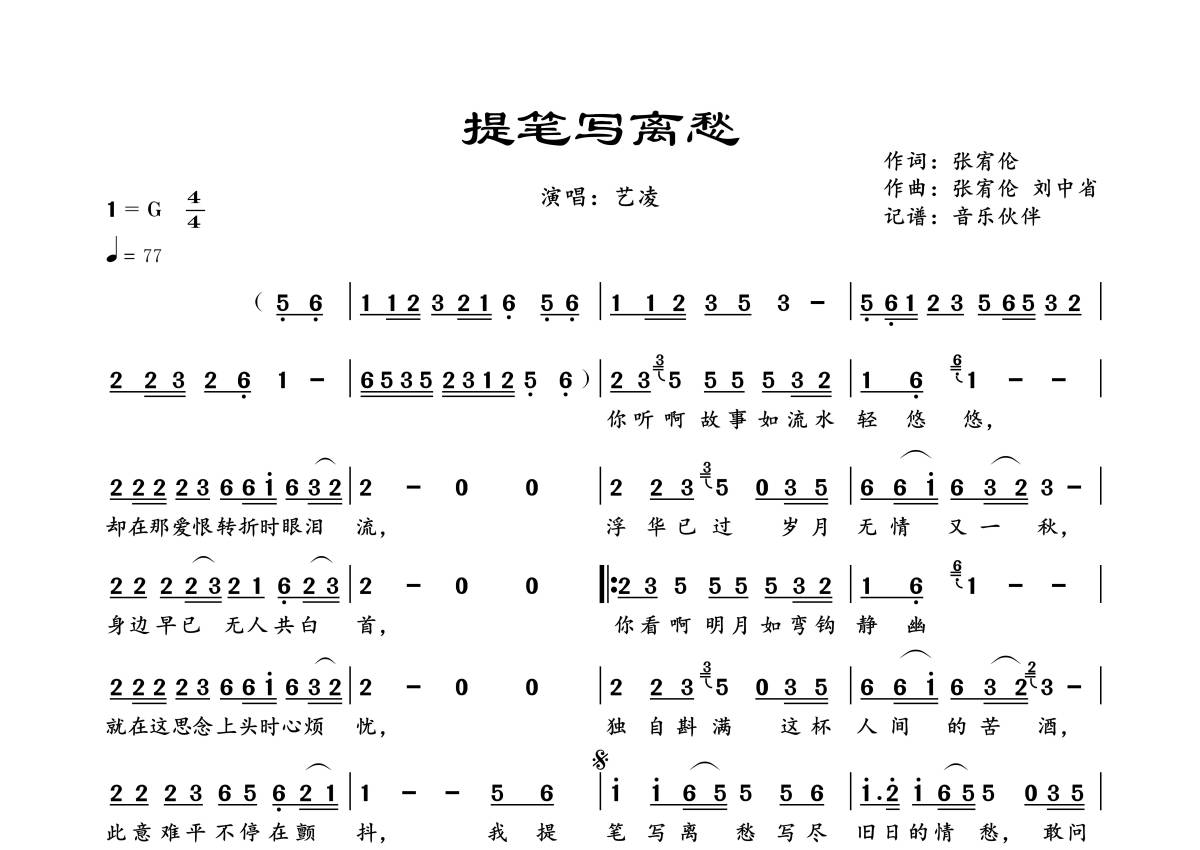 《提笔写离愁》是艺凌演唱的一首歌曲,拍号为4/4拍,歌曲速度为每分钟77拍,这份简谱共有一张高清图谱,图谱由 @音乐伙伴 编配上传。