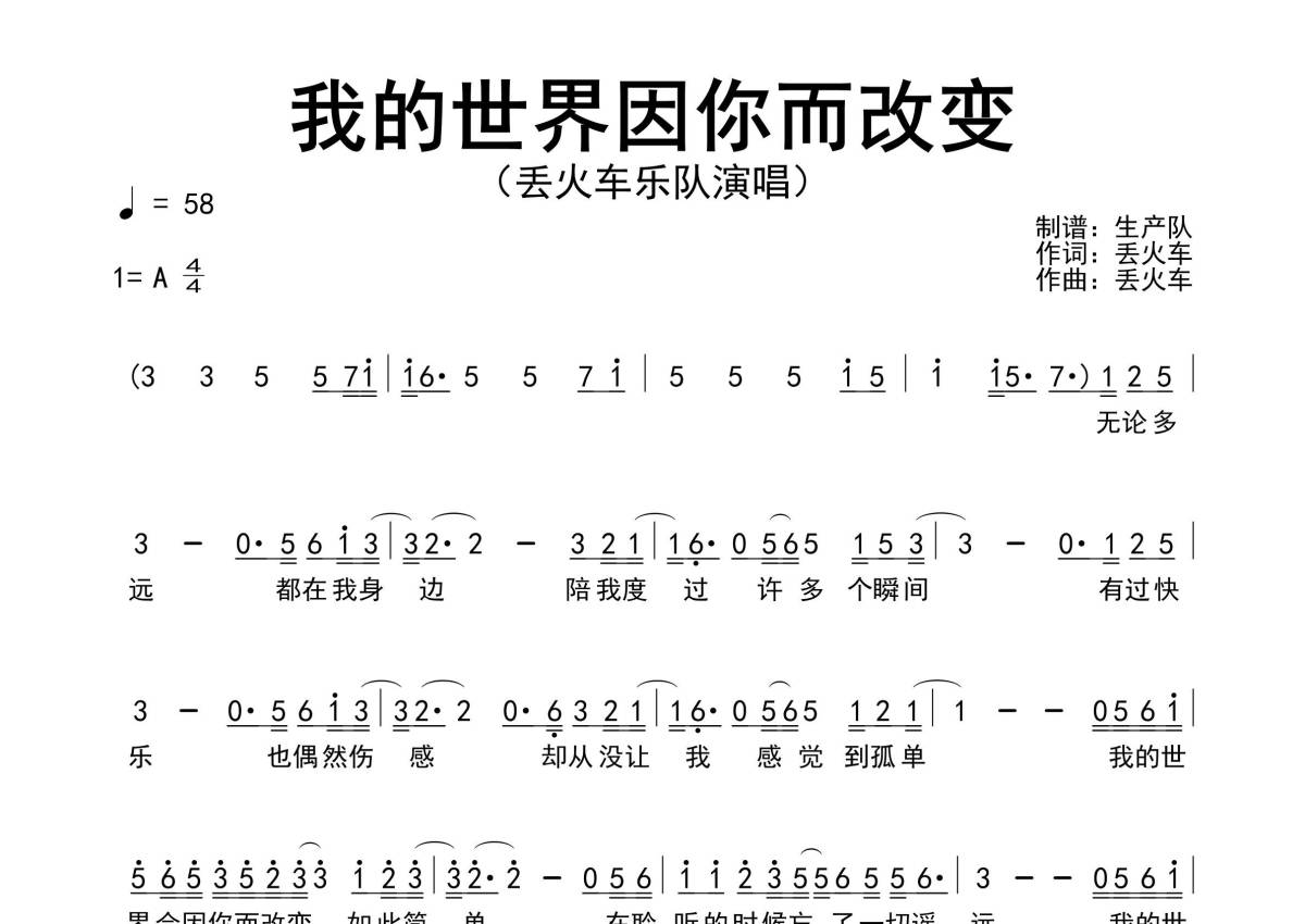 《我的世界因你而改变》是丢火车乐队演唱的一首歌曲,原版简谱,拍号为4/4拍,歌曲速度为每分钟58拍,这份简谱共有两张高清图谱,图谱由 @生产队 编配上传丢火车乐队演唱的歌曲《我的世界因你而改变》原版简谱,含前奏、间奏solo编配。