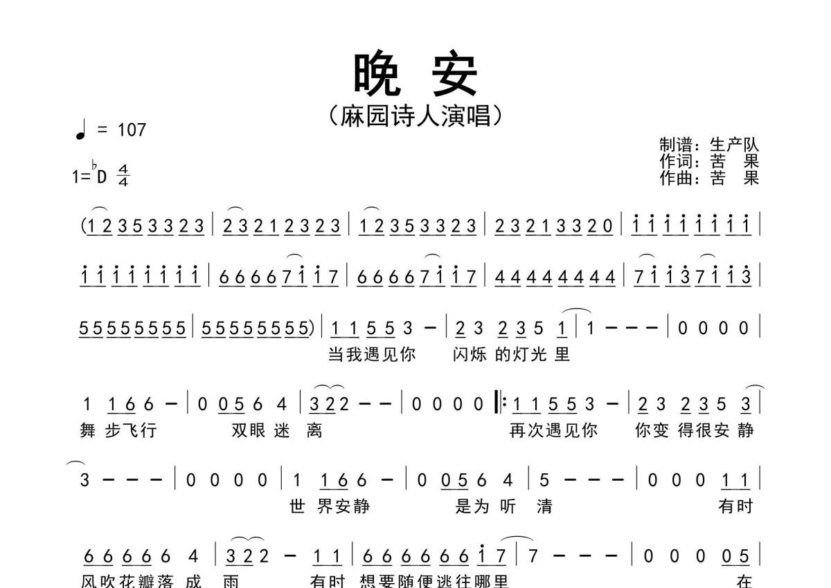 《晚安》是麻园诗人演唱的一首歌曲,原版简谱,拍号为4/4拍,歌曲速度为每分钟107拍,这份简谱共有一张高清图谱,图谱由 @生产队 编配上传麻园诗人演唱的歌曲《晚安》原版简谱,含前奏、间奏solo编配。