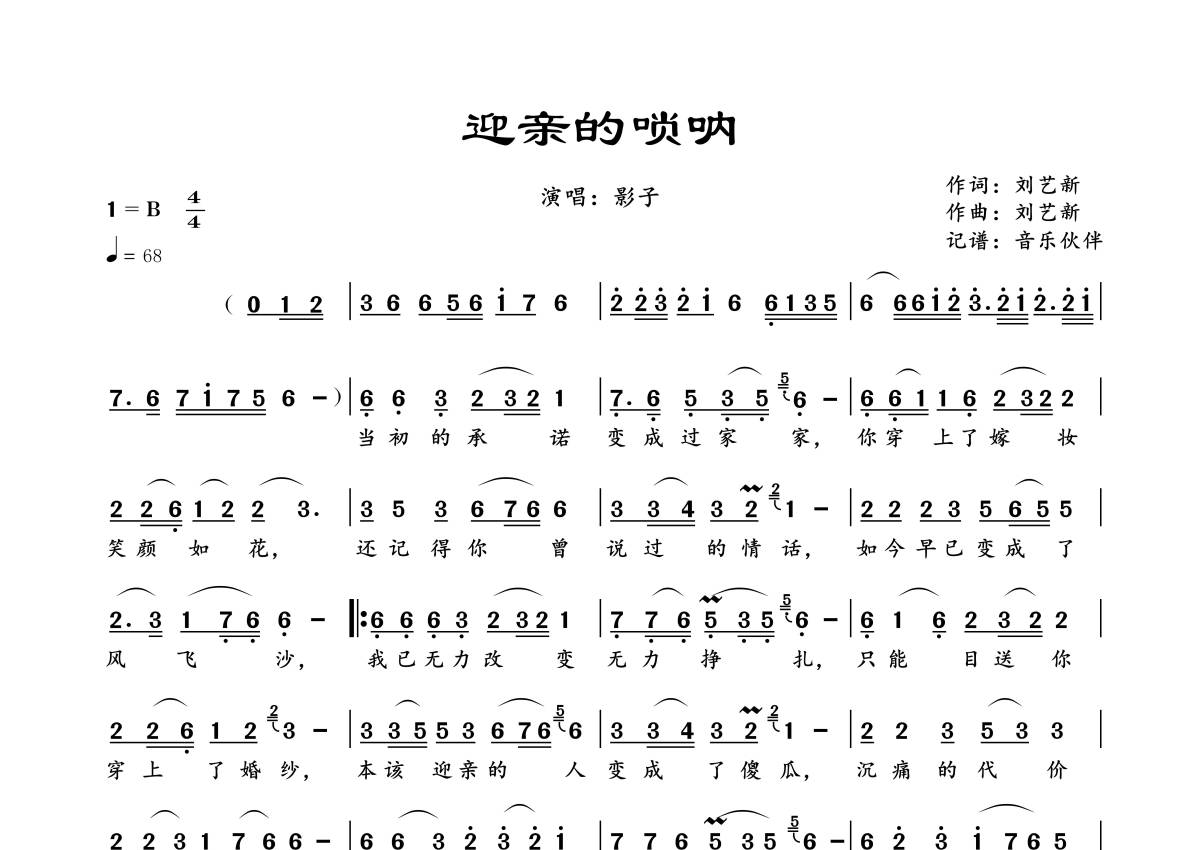 《迎亲的唢呐》是影子演唱的一首歌曲,拍号为4/4拍,歌曲速度为每分钟68拍,这份简谱共有一张高清图谱,图谱由 @音乐伙伴 编配上传。