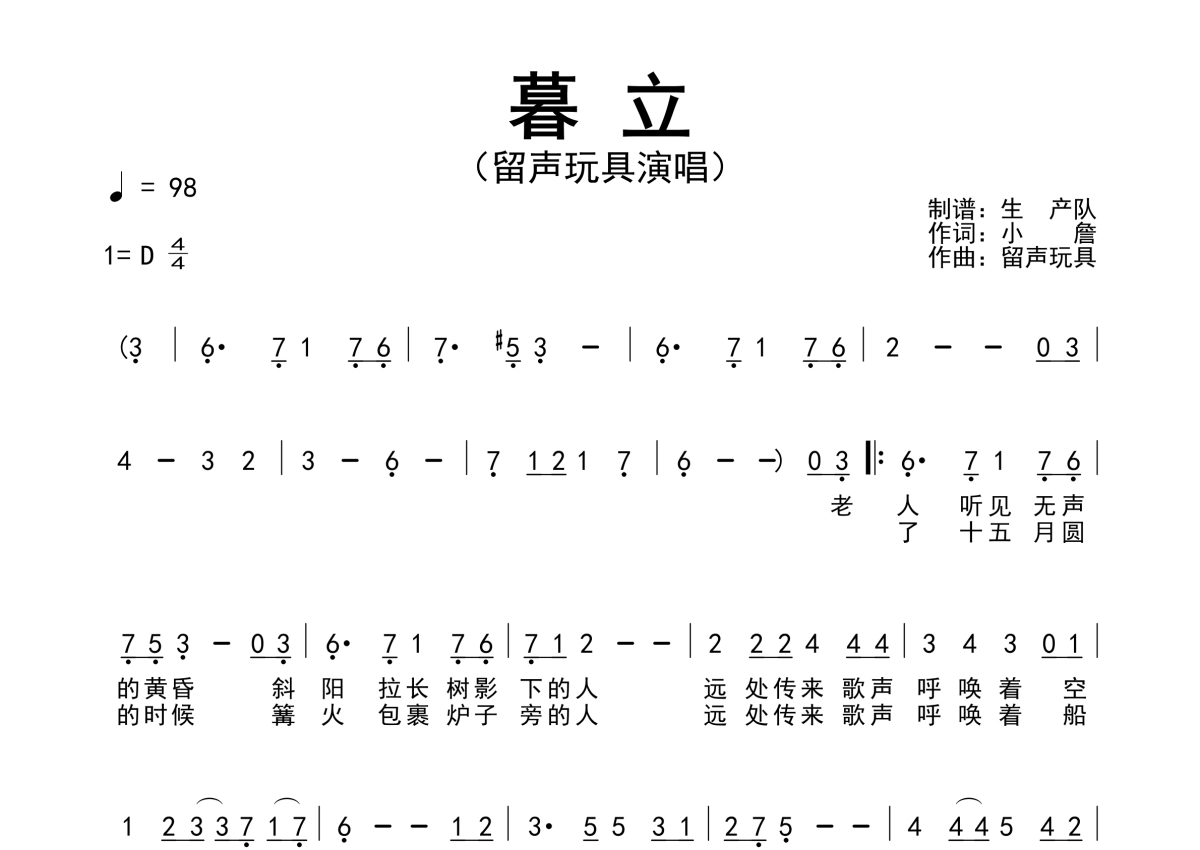 《暮立》是留声玩具演唱的一首歌曲,原版简谱,拍号为4/4拍,歌曲速度为每分钟98拍,这份简谱共有两张高清图谱,图谱由 @生产队 编配上传留声玩具演唱的歌曲《暮立》原版简谱,完整的前奏、间奏和solo编配。