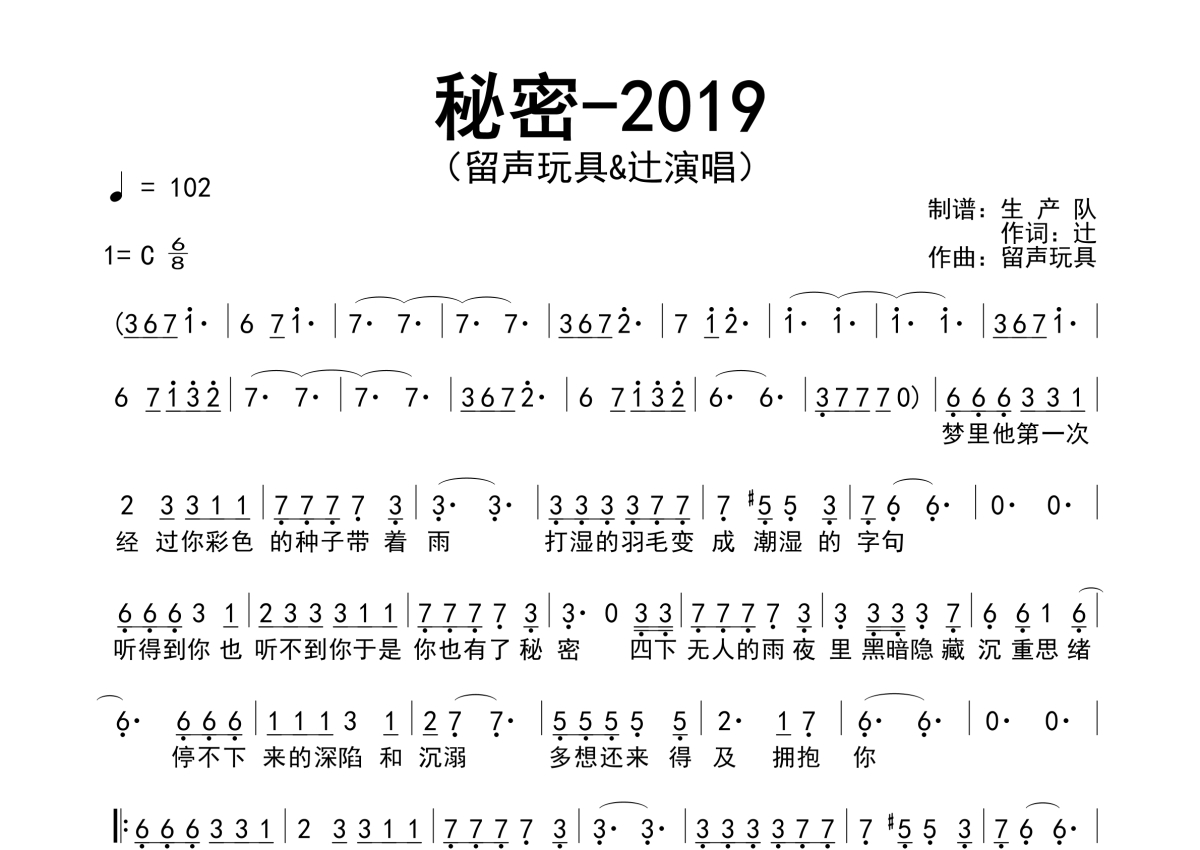 《秘密-2019》是留声玩具演唱的一首歌曲,原版简谱,这份简谱共有一张高清图谱,图谱由 @生产队 编配上传留声玩具演唱的歌曲《秘密-2019》原版简谱,完整的前奏、间奏、尾奏和solo编配。