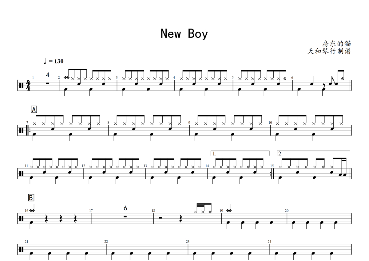 房东的猫《New Boy》架子鼓谱