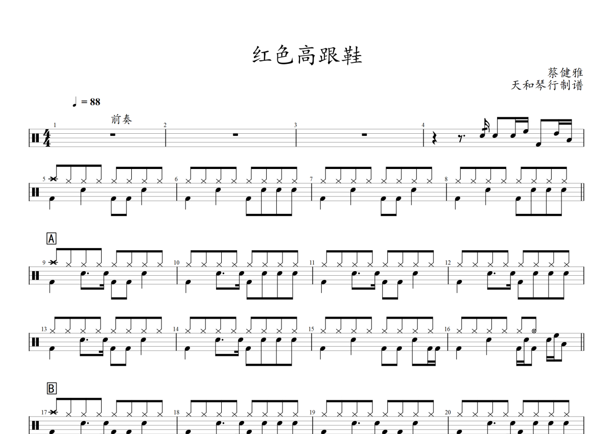 《红色高跟鞋》是蔡健雅演唱的一首歌曲,拍号为4/4拍,歌曲速度为每分钟88拍,这份架子鼓谱共有两张高清图谱,图谱由 @音符喷血者 编配上传,图谱使用五线谱编配,使用这份红色高跟鞋架子鼓谱,你将能够轻松地敲打出这首蔡健雅的红色高跟鞋,快来尝试吧。
