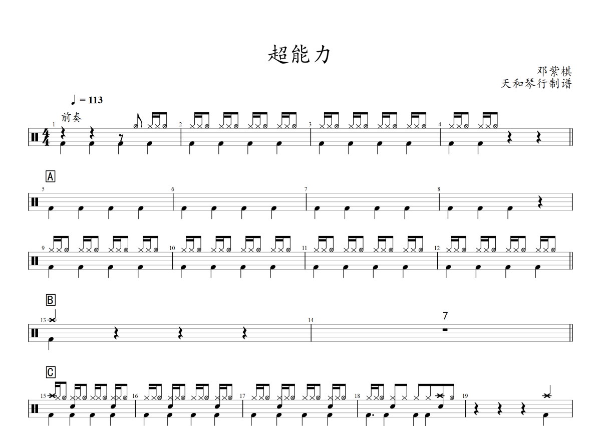 《超能力》是邓紫棋演唱的一首歌曲,拍号为4/4拍,歌曲速度为每分钟113拍,这份架子鼓谱共有两张高清图谱,图谱由 @音符喷血者 编配上传,图谱使用五线谱编配,使用这份超能力架子鼓谱,你将能够轻松地敲打出这首邓紫棋的超能力,快来尝试吧。
