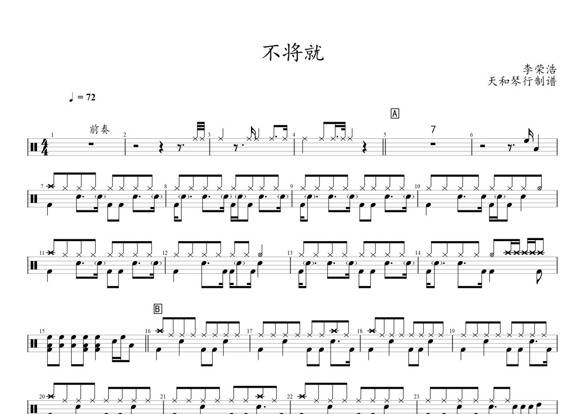 《不将就》是李荣浩演唱的一首歌曲,拍号为4/4拍,歌曲速度为每分钟72拍,这份架子鼓谱共有两张高清图谱,图谱由 @音符喷血者 编配上传,图谱使用五线谱编配,使用这份不将就架子鼓谱,你将能够轻松地敲打出这首李荣浩的不将就,快来尝试吧。