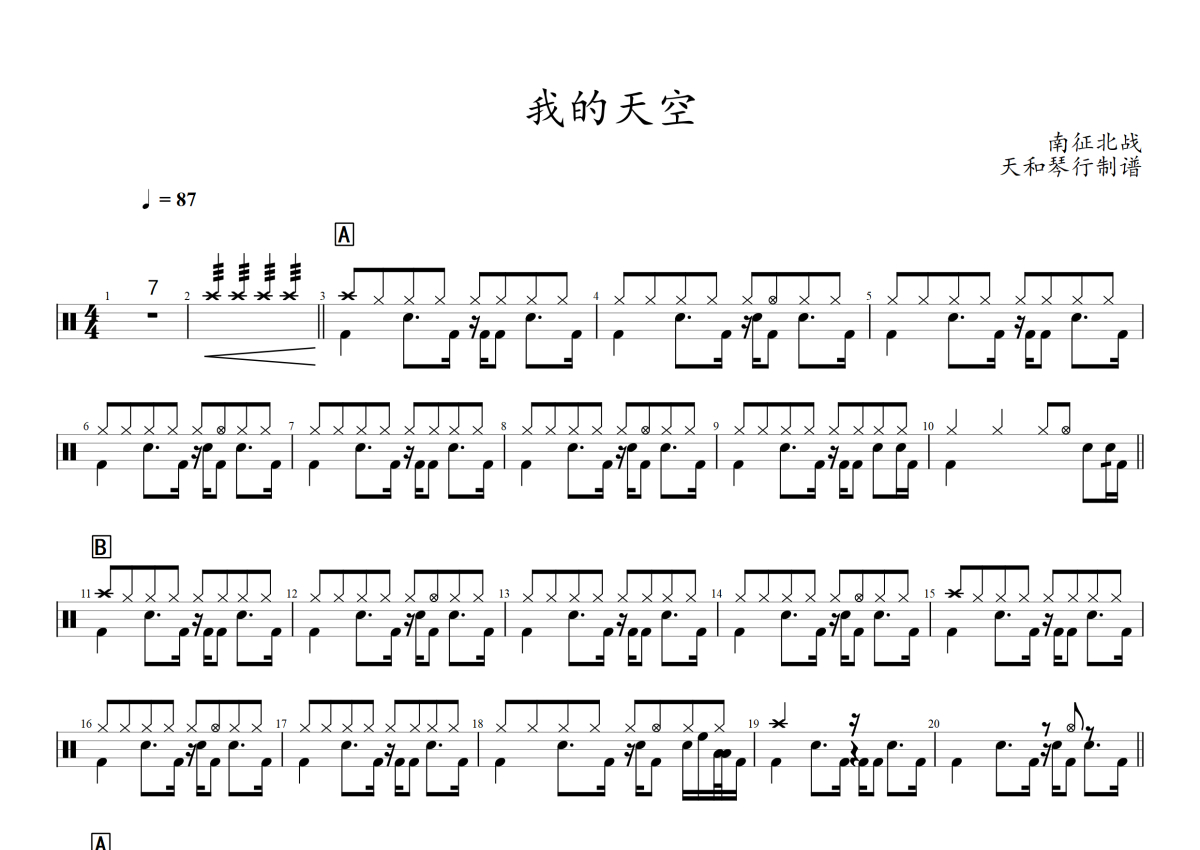 《我的天空》是南征北战NZBZ演唱的一首歌曲,歌曲速度为每分钟87拍,这份架子鼓谱共有两张高清图谱,图谱由 @音符喷血者 编配上传,图谱使用五线谱编配,使用这份我的天空架子鼓谱,你将能够轻松地敲打出这首南征北战NZBZ的我的天空,快来尝试吧。
