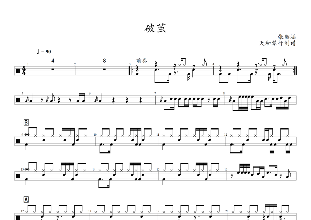 《破茧》是张韶涵演唱的一首歌曲,拍号为4/4拍,歌曲速度为每分钟90拍,这份架子鼓谱共有两张高清图谱,图谱由 @音符喷血者 编配上传,图谱使用五线谱编配,使用这份破茧架子鼓谱,你将能够轻松地敲打出这首张韶涵的破茧,快来尝试吧。