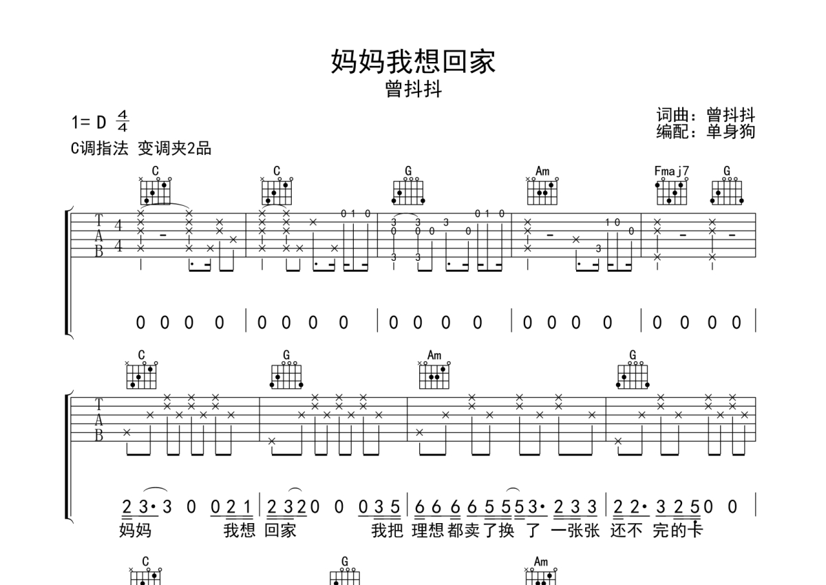 《妈妈我想回家》是曾抖抖演唱的一首歌曲,拍号为4/4拍,歌曲原调为D调,但由于原调指法比较难,为了方便弹奏,本吉他谱采用的是C调指法编配,变调夹2品弹奏即为原调,当然也可以根据自己的音域改变变调夹位置,或者通过改变和弦调性,以方便自己弹奏,这份吉他谱共有四张高清图谱,图谱由 @单身狗 编配上传,图谱使用六线谱编配,包含吉他和弦指法、简谱以及歌词部分,使用这份妈妈我想回家吉他谱,可以让你更加方便地掌握这首歌曲的弹唱技巧,快来尝试吧。