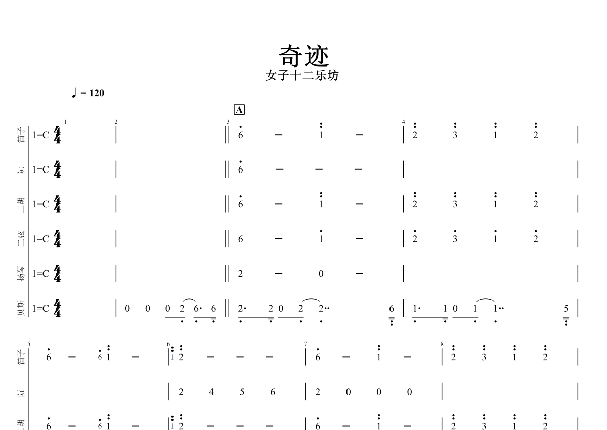 《奇迹》是女子十二乐坊演唱的一首歌曲,石头音乐原版记谱,拍号为4/4拍,歌曲速度为每分钟120拍,这份乐队总谱共有七张高清图谱,图谱由 @石头音乐 编配上传购买后有PDF和GP文件提供。
