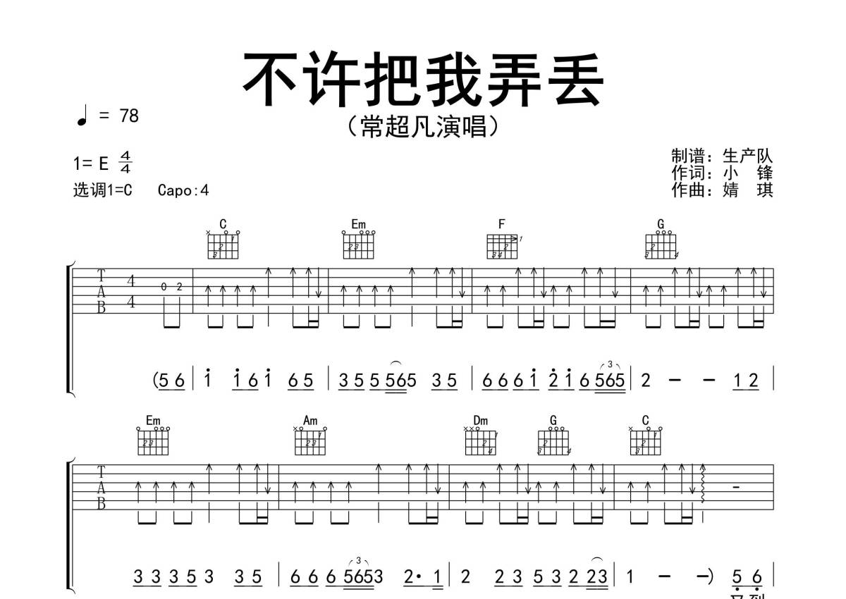 《不许把我弄丢》是常超凡演唱的一首歌曲,精编完美版,拍号为4/4拍,歌曲速度为每分钟78拍,歌曲原调为E调,但由于原调指法比较难,为了方便弹奏,本吉他谱采用的是C调指法编配,变调夹4品弹奏即为原调,当然也可以根据自己的音域改变变调夹位置,或者通过改变和弦调性,以方便自己弹奏,这份吉他谱共有三张高清图谱,图谱由 @生产队 编配上传,图谱使用六线谱编配,包含吉他和弦指法、简谱以及歌词部分,使用这份不许把我弄丢吉他谱,可以让你更加方便地掌握这首歌曲的弹唱技巧,快来尝试吧。《不许把我弄丢》是常超凡演唱的一首歌曲,作词:小锋 作曲:婧琪 ,收录在同名专辑《不许把我弄丢》中。本吉他谱根据原版C调指法编配,精准的前奏、间奏、尾奏和SOLO编配,精编一音不差版,值得推荐!。