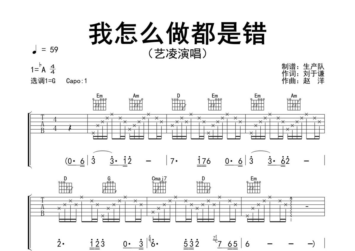 《我怎么做都是错》是艺凌演唱的一首歌曲,精编完美版,拍号为4/4拍,歌曲速度为每分钟59拍,歌曲原调为Ab调,但由于原调指法比较难,为了方便弹奏,本吉他谱采用的是G调指法编配,这份吉他谱共有三张高清图谱,图谱由 @生产队 编配上传,图谱使用六线谱编配,包含吉他和弦指法、简谱以及歌词部分,使用这份我怎么做都是错吉他谱,可以让你更加方便地掌握这首歌曲的弹唱技巧,快来尝试吧。《我怎么做都是错》是由艺凌演唱的一首歌曲,作词:刘于谦,作曲:赵洋,收录在同名专辑《我怎么做都是错》中。本吉他谱根据原版G调指法编配,完整的前奏、间奏、尾奏和SOLO编配,精编完美版版,值得推荐!。