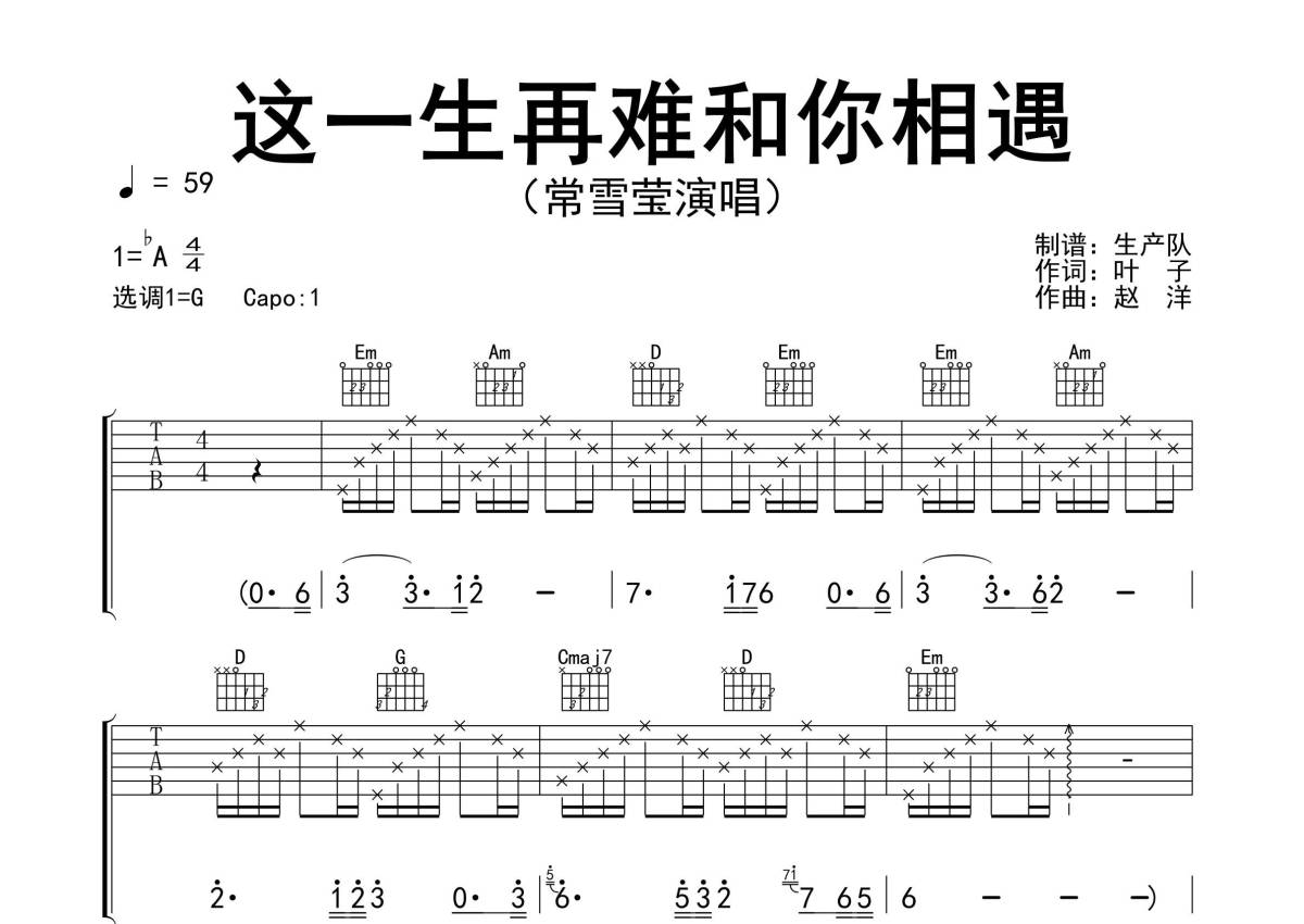 《这一生再难和你相遇》是常雪莹演唱的一首歌曲,精编完美版,拍号为4/4拍,歌曲速度为每分钟59拍,歌曲原调为Ab调,但由于原调指法比较难,为了方便弹奏,本吉他谱采用的是G调指法编配,这份吉他谱共有三张高清图谱,图谱由 @生产队 编配上传,图谱使用六线谱编配,包含吉他和弦指法、简谱以及歌词部分,使用这份这一生再难和你相遇吉他谱,可以让你更加方便地掌握这首歌曲的弹唱技巧,快来尝试吧。《这一生再难和你相遇》是由常雪莹演唱的一首歌曲,作词:叶子,作曲:赵洋,收录在同名专辑《这一生再难和你相遇》中。本吉他谱根据原版G调指法编配,完整的前奏、间奏、尾奏和SOLO编配,精编完美版版,值得推荐!。