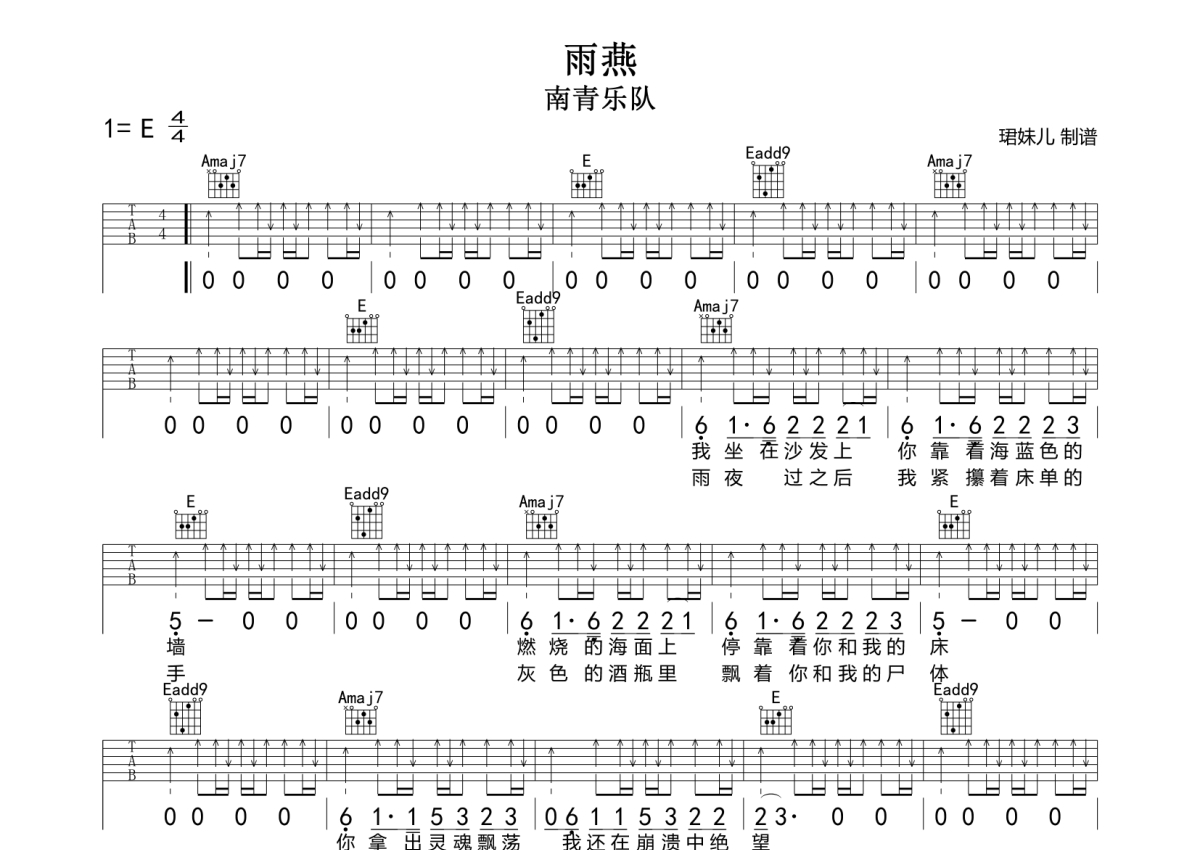 雨燕吉他谱 - 南青乐队 - E调弹唱六线谱