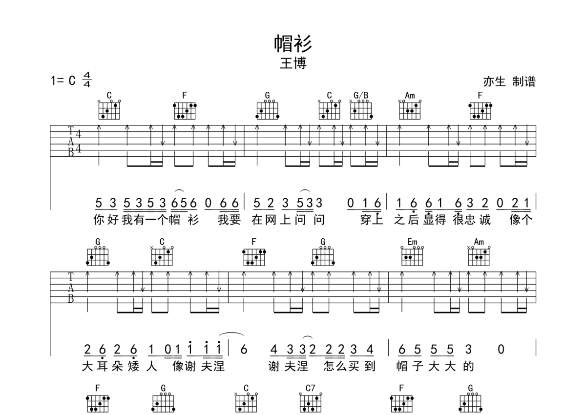 《帽衫》是王博演唱的一首歌曲,拍号为4/4拍,歌曲原调为C调,本吉他谱采用的是C调指法编配,演奏时不需要使用变调夹即为原调,这份吉他谱共有一张高清图谱,图谱由 @亦生 编配上传,图谱使用六线谱编配,包含吉他和弦指法、简谱以及歌词部分,使用这份帽衫吉他谱,可以让你更加方便地掌握这首歌曲的弹唱技巧,快来尝试吧。